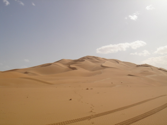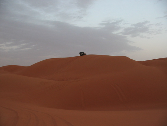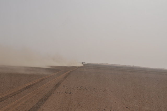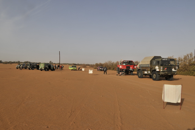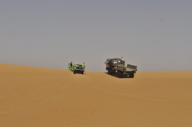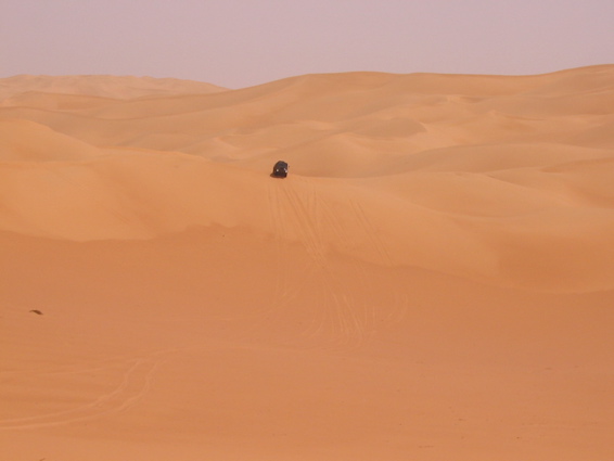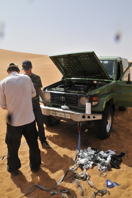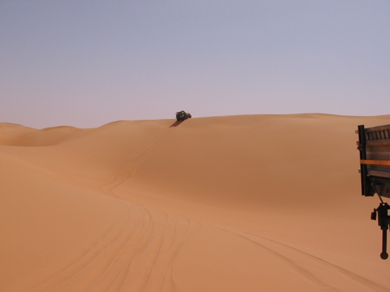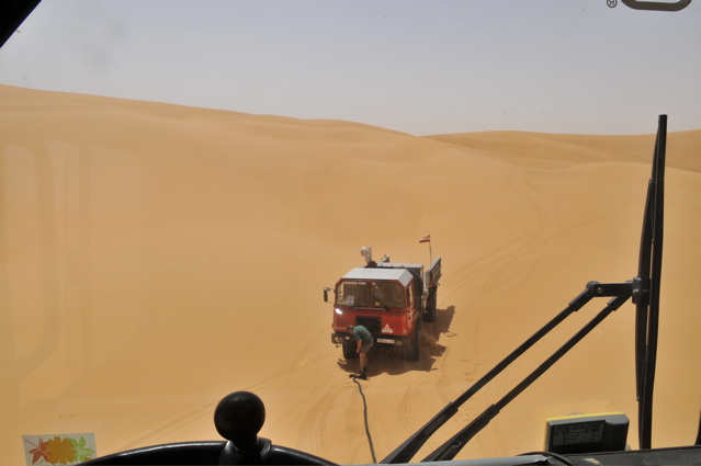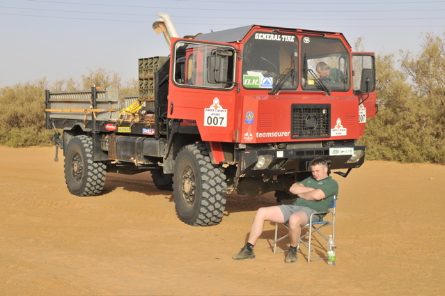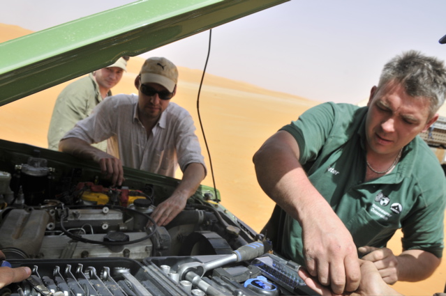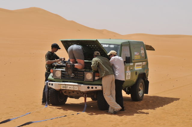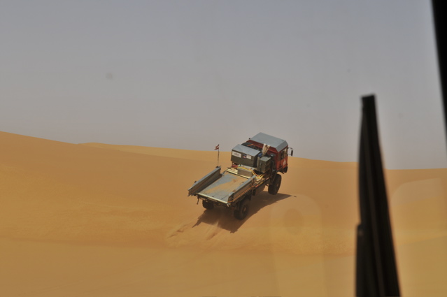 Pünktlich um 6.00 verlassen wir zusammen mit den CP Besatzungen und der Zielbesatzung den Campingplatz von Camp Afrika und fahren 59 km auf der Straße zum Start, den wir Saurer dann da auch durchgeführt haben. Mitten in der nächsten größeren Stadt auf dem Weg zum Start haben wir den Anschluß verloren und standen auf einmal vor einer Kaserne wo uns ein seltsam gekleideter Soldat mit seiner Kalaschnikov grimmig angeschaut hat, uns dann aber doch auf die richtige Straße geschickt hat. Da unsere Beifahrer nicht gerade vernarrt in das Roadbookfahren waren, und der Servicetrack im TTQV auch nicht auffindbar war, sind wir dann halt fast in Luftlinie zu dem Startpunkt raus. Langsam haben wir Routine beim Starten und es verläuft Alles reibungslos. Als Harddl mit seinem Unimog als Letzter durch ist, haben wir wie auf Kommando die Startschilder aus dem Boden gerissen und sind sofort hinter Harddl her. Es waren versandete Pisten und weite sandige Ebenen und für eine viertel Stunde war der Rennunimog von Harddl immer in Sichtweite. Dann hat leider seine Kupplung wieder angefangen zu stinken und er ist vorsichtshalber rumgedreht und auf der Straße zum nächsten Camp. (So ein Spielverderber, der Unimog) Wir waren aber nicht lange alleine, denn wir sind an einer langen, weichen Düne auf Daniel Wiesel und seinen Isuzu Proto Pick Up aufgefahren der Leistungsprobleme hatte , weil sein Luftfilter dauernd mit Sand voll war. Eine provisorische Reperatur bzw Veränderung des Luftfiltergehäuses brachte Besserung und bald war er in den Dünen vor uns verschwunden. Einmal sind wir einigen Autospuren links hoch, die uns aber in die Nähe einer Ölbohrstation brachten und nicht auf die Ralleystrecke. Die Abkürzung zurück diagonal war uns zu steil und zu lang. Dimitri: "Rudi würde sagen, da fahret wir net runter!" Als wir dann wieder auf unseren Spuren auf dir Ralllystrecke zurückgekommen sind, mussten wir dann so manche steile Düne runter die der die wir verweigert hatten auch in Nichts nachstand. Es gab viele große Trichter und manchen konnte man nur mit richtig Schwung und ohne Rücksicht auf das Fahrwerk entkommen, besonders wenn man auf der Lee Seite der Düne die letzten 2m im steilen, weichen Sand hoch muss. Bald erreichen wir den Platz von CP1, die Taudiens sind aber schon weg und wir fahren weiter. Nachmittags, wir sind gerade in einem langen Sandtal und schöpfen wieder Hoffnung, dass wir es doch noch heute ins Camp schaffen, kommt auf einmal wie aus dem Nichts ein Funkspruch zu uns: "Teamsaurer für Medic 1 kommen ?!" Ich: "Teamsaurer hört" Medic: "Wir haben einen Kunden für euch, wir sind ungefähr im Roadbuchbild ..." Dimitri hat kurz im Roadbook geschaut wo das ist und wir waren nach ein paar Minuten da. Der grüne Toyota der Eisenmänner war beim Rückwärts Fahren in den Dünen langsam umgekippt. Besonders ärgerlich, dass die 2 zu dieser Zeit noch die Gesamtführenden der Rallye waren, jetzt nicht mehr. Bevor wir da waren hat Clemens und der Teilnehmer Andreas Wulf den Toyota wieder aufgestellt, nur hat der Anlasser es dann nicht mehr geschafft den Motor durchzudrehen. Dann hat Clemens den Renntoyo hinter seinen NEF Toyota gehängt und versucht anzuschleppen und dadurch natürlich den wahrscheinlichen Ölschlag im Motor noch verschlimmert, da jetzt durch das Anschleppen die Gefahr noch größer wurde die Innereien des Motors richtig zu Verbiegen. Als wir ankamen, hat Petzi Dimitri zur Seite geschoben: "Des is a kleines Auto, jetzt habe ich auch endlich was zu tun!" Petzi baut zuerst die Glühkerzen aus und einer der Eisenmänner macht einen Startversuch, mit dem Ergebnis, dass Unmengen von Öl wie Fontänen aus dem Motor kommen und Petzi total mit Öl einsauen. Auch ein paar Umstehende und meine Nikon bekommen was ab. Anschließend wird der Motorraum mit Diesel gewaschen, Glühkerzen wieder rein und der Motor läuft so halbwegs wieder, aber nicht wirklich rund. Die Eisenmänner fahren langsam weiter, das Rennen an sich ist für diese Libya Rally Raid leider gelaufen. Nachdem wir von uns selbst das Gröbste an Öl von Kleidung und Gesicht entfernt hatten, sind wir im Convoi mit Clemens, dem Notarzt, weiter in Richtung CP2. Kurz davor erhält Clemens einen Notruf, "kurz" vor dem Ziel hat es einen Überschlag eines Teilnehmers gegeben, die Beifahrerin ist leicht verletzt und das Auto nicht mehr fahrfähig. Sofort alarmiert Clemens seinen Arztkollegen der näher dran ist und stellt fest, dass dieser an der CP2 bei Herbert Pöltl steht, ganz nah bei uns. Clemens fährt jetzt noch mit uns zusammen die paar Kilometer zu seinem Arztkollegen, der sonst u.a. auch oft der Notarzt im Rettungshubschrauber in Salzburg ist, und dann fahren dieses 2 Notarzt Toyotas schnell alleine zu dem Unfall. Herbert Pöltl, mit einem Handfunkgerät von uns versehen, und wir machen uns auch mal grob in diese Richtung, während wir dann auch einen Anruf bekommen, der uns die Koordinaten des Havaristen durchgibt. Ich habe Herbert diesen Punkt auf einen Zettel geschrieben und er fährt jetzt als unser Scout voraus. Vor lauter Gerumpel auf der meist pistenlosen Schotter - Sandfläche wo wir jetzt sind, haben wir es vor lauter Fahren noch nicht geschafft die Koordinaten in unser GPS einzugeben. Nach 2-3 interessanten Dünengürtelquerungen wird es klar, dass es langsam zeitlich eng wird um die Unfallstelle noch im Hellen zu erreichen. Manchmal hören wir abgehackte Fetzen am Funk von den Medics, die schon viel früher da waren und und mit 2 Notärzten 1. Hilfe leisten, so schlimm scheint es die Beifahrerin nicht erwischt zu haben - wir sind erleichtert, der Frau geht es gut und wir können uns Zeit lassen und das Autofrack auch noch morgen die noch ca. 50km zu Teerstraße rausfahren. Der nächste Dünengürtel kommt und einige Spuren der Teilnehmer führen abseits der Rallystrecke geradeaus darüber hinweg. Nach ein paar unsinningen Anfahrversuchen über einen verschachtelten Dünenkamm zu kommen, bleibe ich mit 